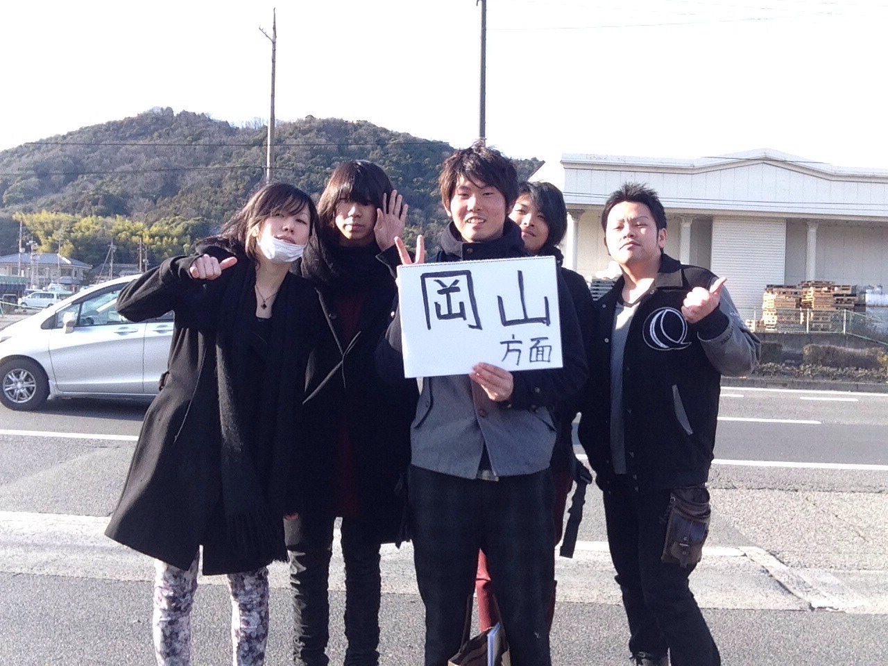 途中、スケッチブックに「岡山方面」と書いて立っていた青年を見つけると、